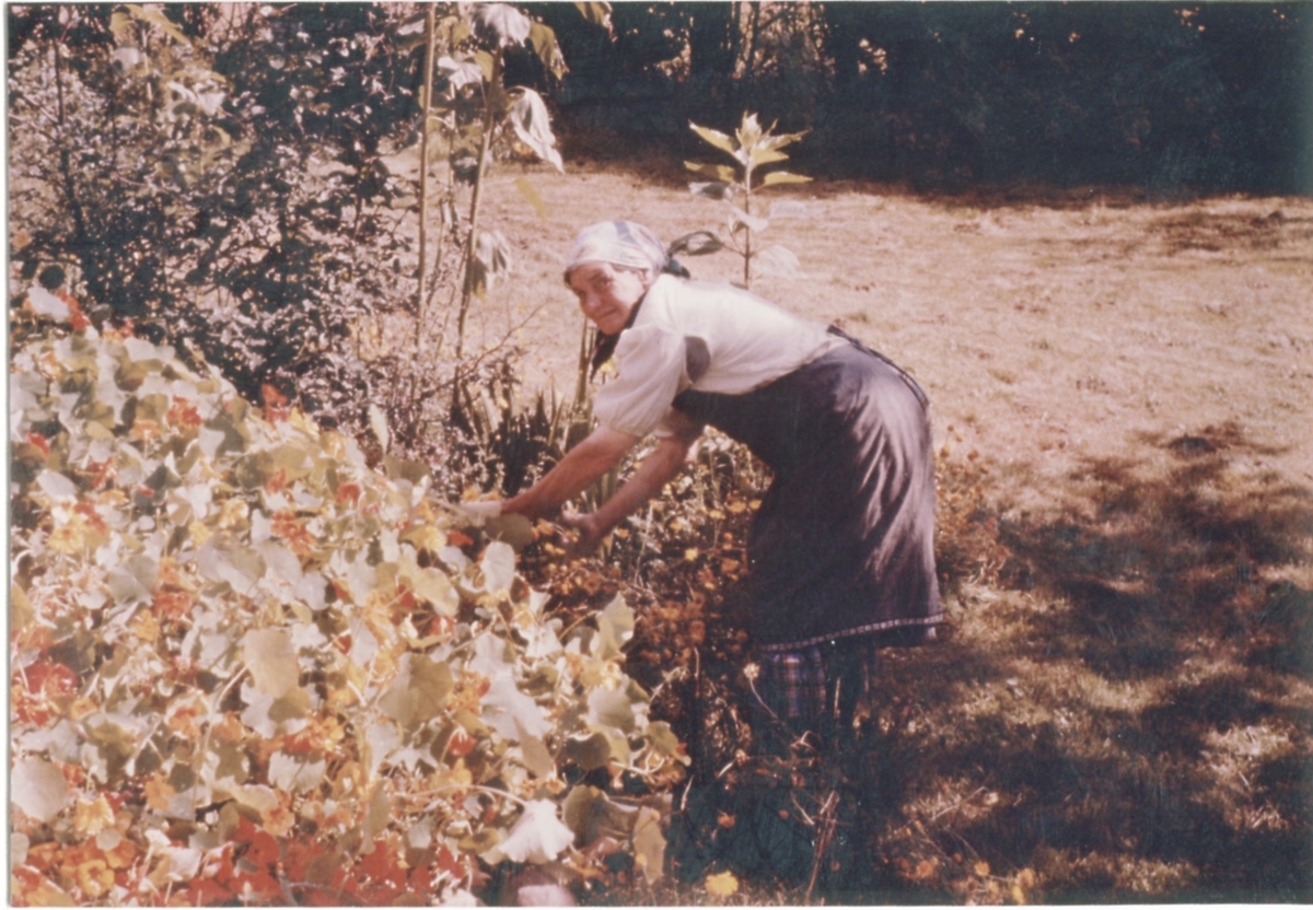 Hilda Sandberg (1887-1973) arbetar i sin trädgård, "Sandbergs" Sagered 3:3 1960-tal.