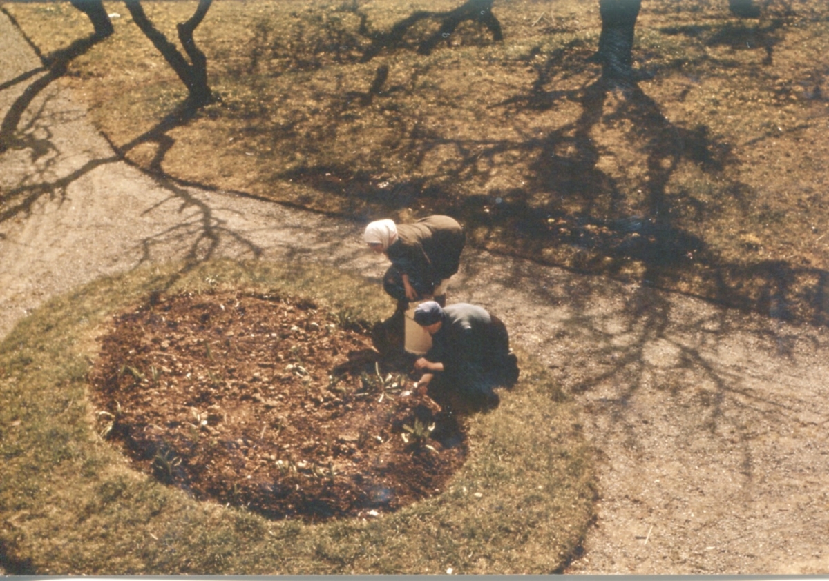 Två personer pysslar i trädgården som ligger nedanför verandan, "Sandbergs" Sagered 3:3 1960-tal. Kvinnan är troligtvis Hilda Sandberg (1887-1973), mannen är okänd.
