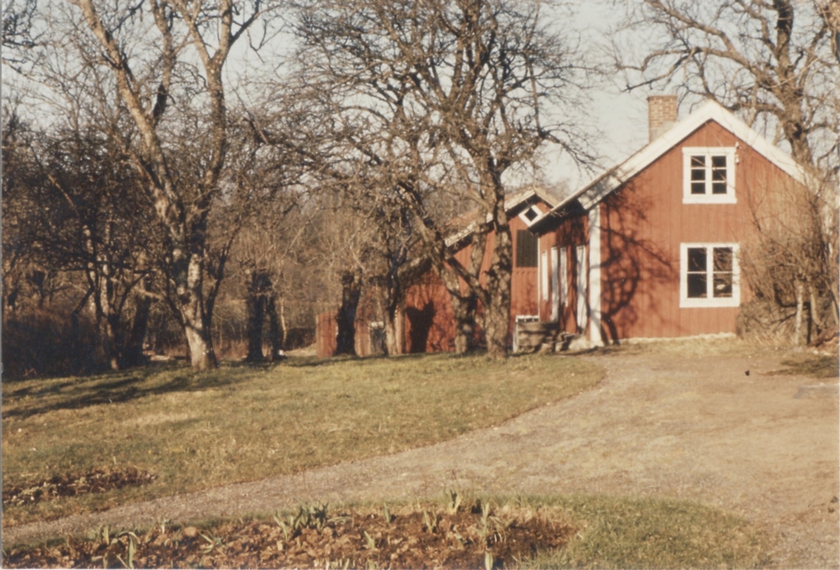 Sandbergs trädgård och flygelbyggnad, Sagered 3:3 1970-tal. Flygeln, troligen från 1700-tal, var brygghus från början och senare ombyggd till två lägenheter för sommargäster. Ladugården skymtas i bakgrunden. Relaterat motiv: A3623.