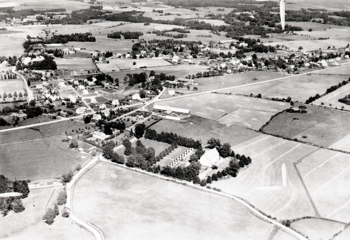 Flygfoto över Smedby med Dörby kyrka i förgrunden.