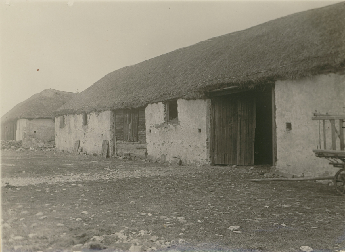 Byn från landsvägen. Överst gårdsinteriör. Gårdarna, dels av trä i skiftesverk, dels av kalksten, har rundade hörn, "dös".