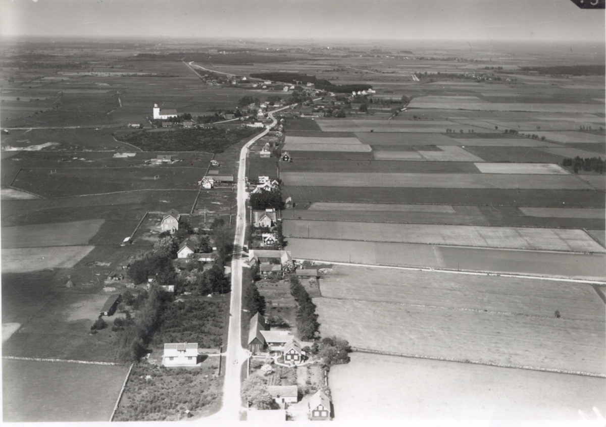 Flygfoto över Gårdby. By med hus, kyrkan och ekonomibyggnader, åkrar samt grusvägen genom byn.