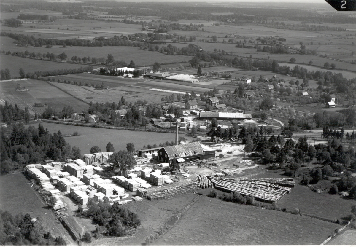 Flygfoto över Åby. Byn med träindustri, ladugård och åkrar.