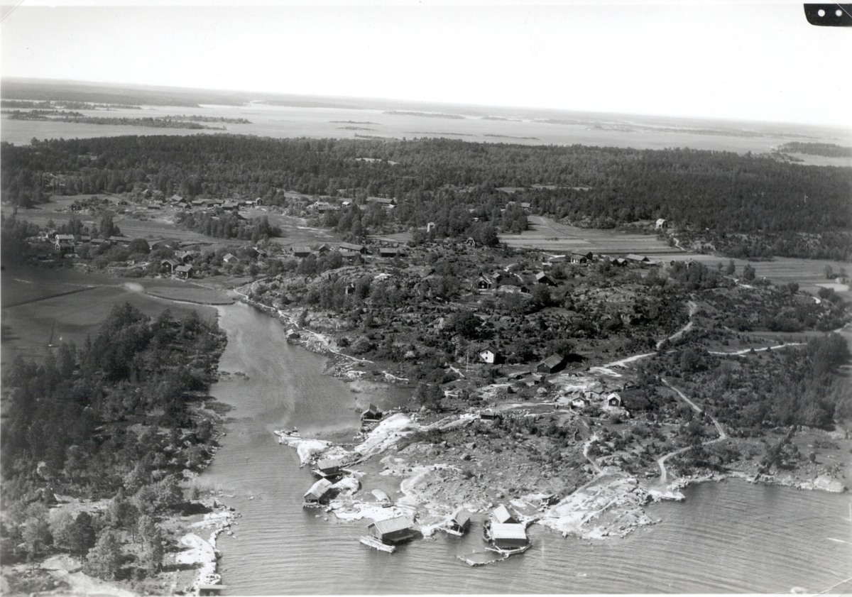 Flygfoto över Östra Eknö med sjöbodar 1935.