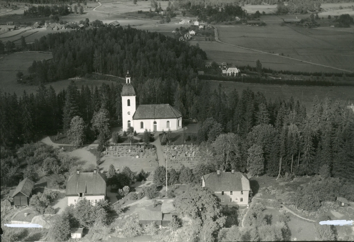 Flygbild över Blackstad sn. Kyrkan och hus samt åkermark.
