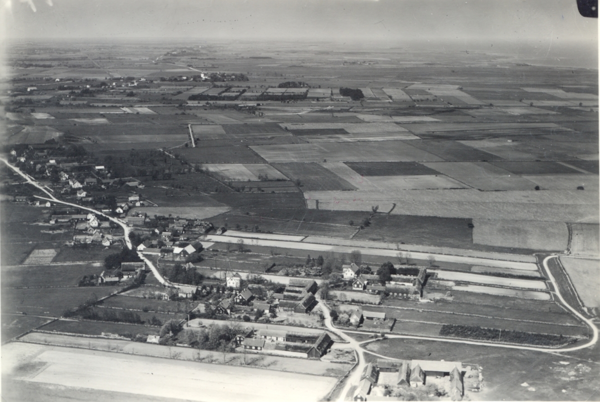 Flygfoto över Bläsinge. I bakgrunden Norra Möckleby kyrka.