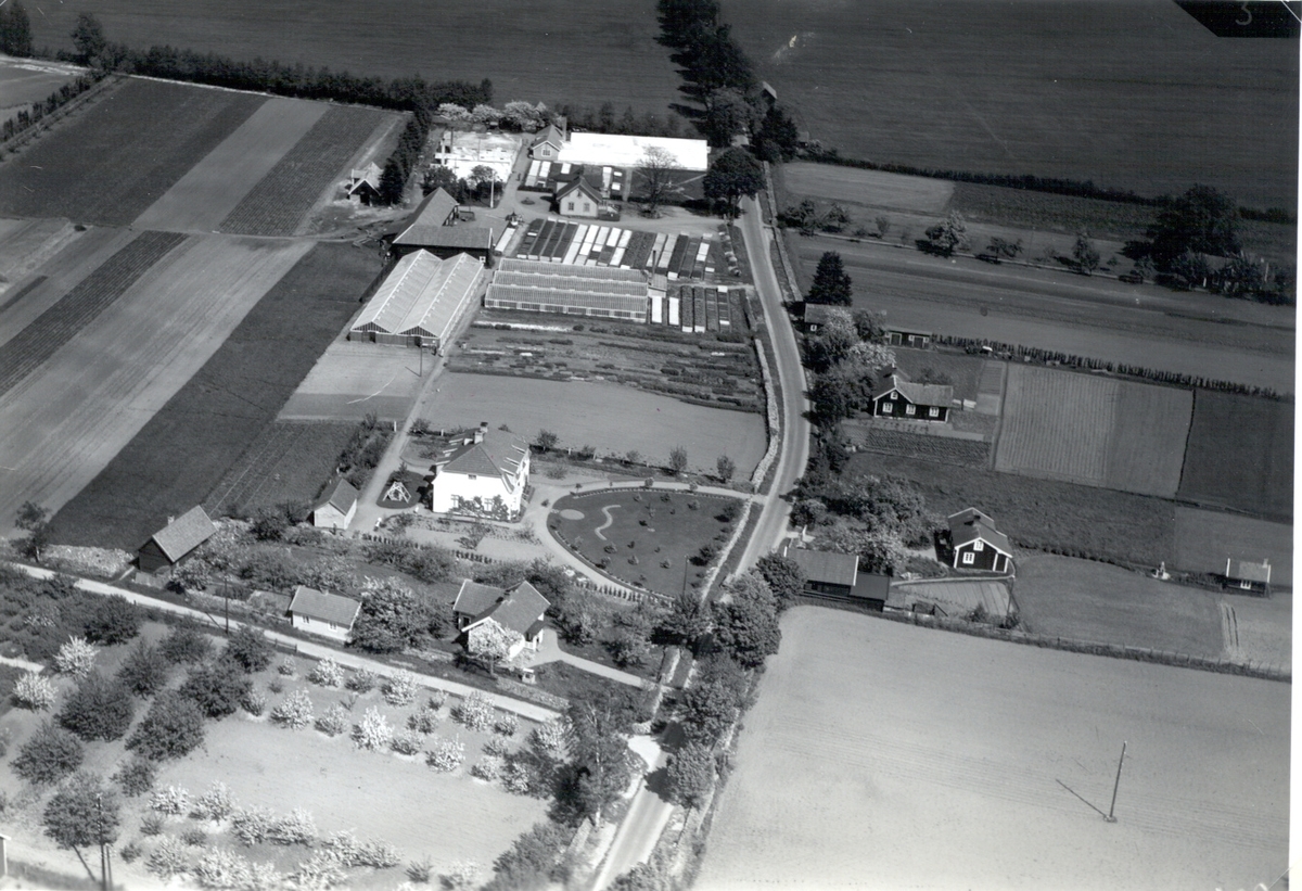 Flygfoto över Åby. Byn med jordbruk, ladugård och ekonomibyggnader samt hus och åkrar och vägen genom byn.