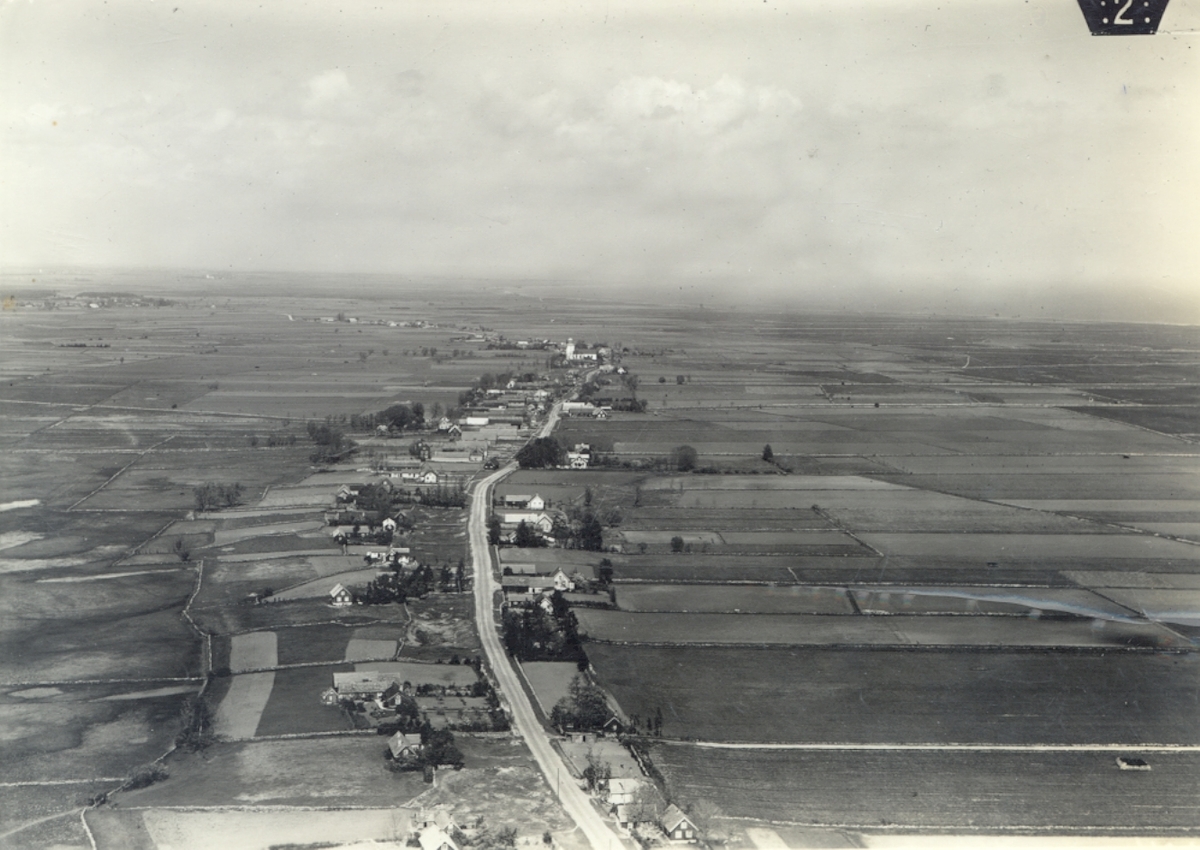 Flygbild över Kvinneby från söder. Norr om byn kan Stenåsa kyrka anas.