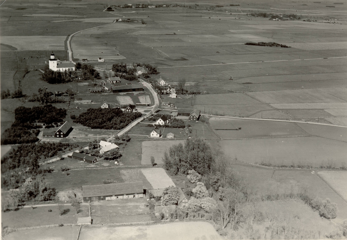 Flygfoto över Bredsättra by och kyrka, odlingslandskap och bostadshus samt ekonomibyggnader.