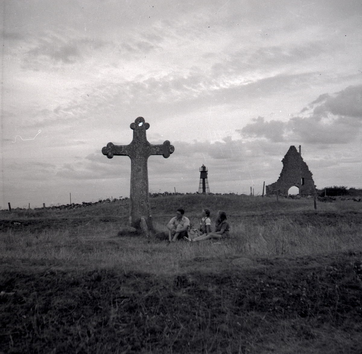 En fyr, kapellruinen Sankta Birgittas kapell (Långöre kapell) och ett klöverbladskors på Kapelludden.