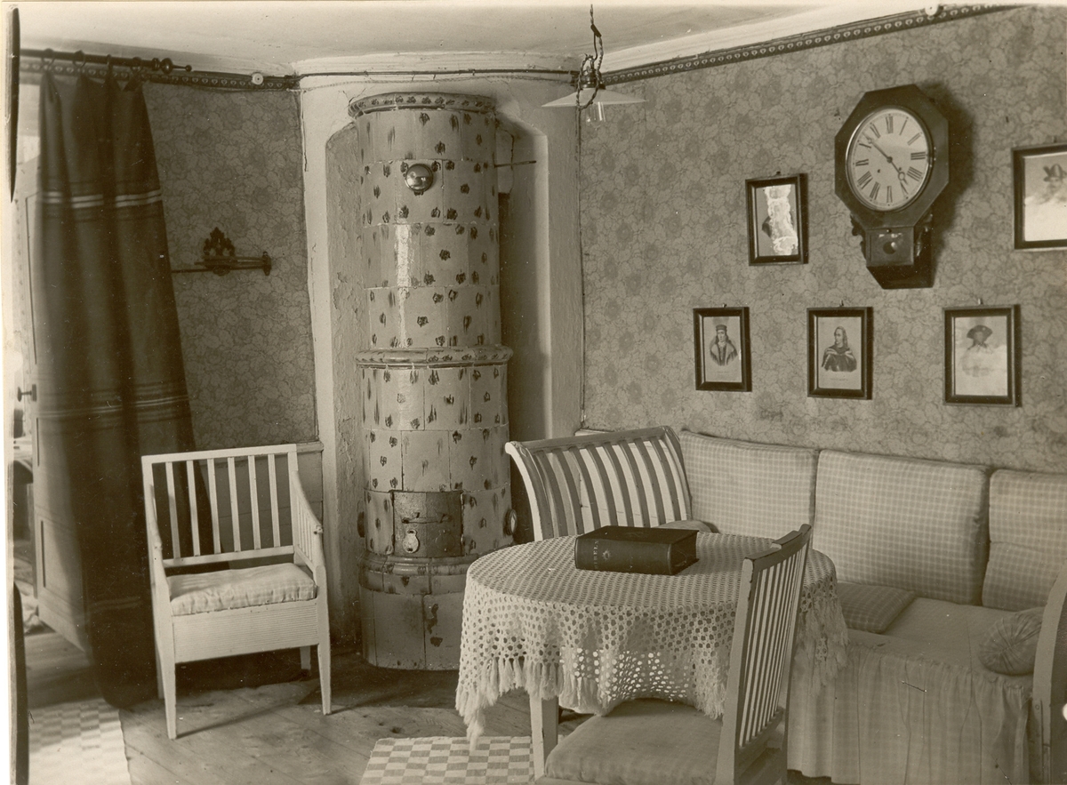 Huvudbyggnaden på Skälby gård. Nedre våningen, jungfrukammare med möbler från Kläckeberga. Länstolen är en nattstol.