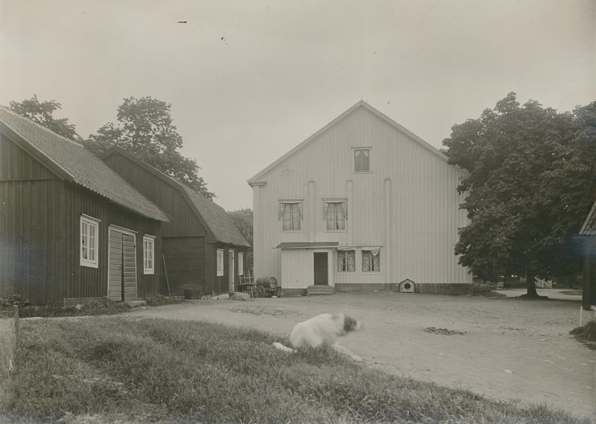 Till höger huvudbyggnaden. Närmast denna en bobyggnad av timmer i stolpar, brutet tak.