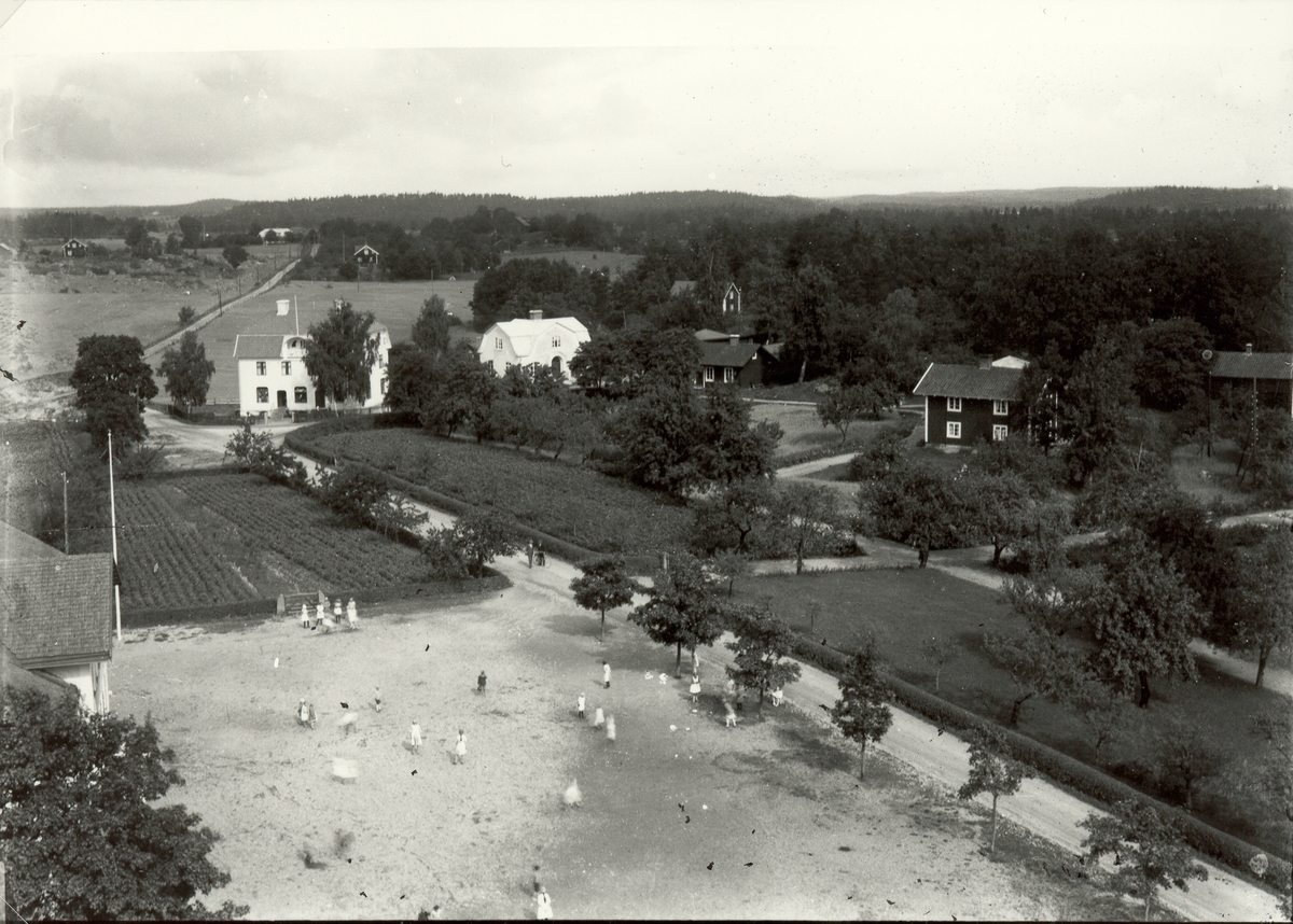Vy över Hjorted med skogården med lekande barn i förgrunden.