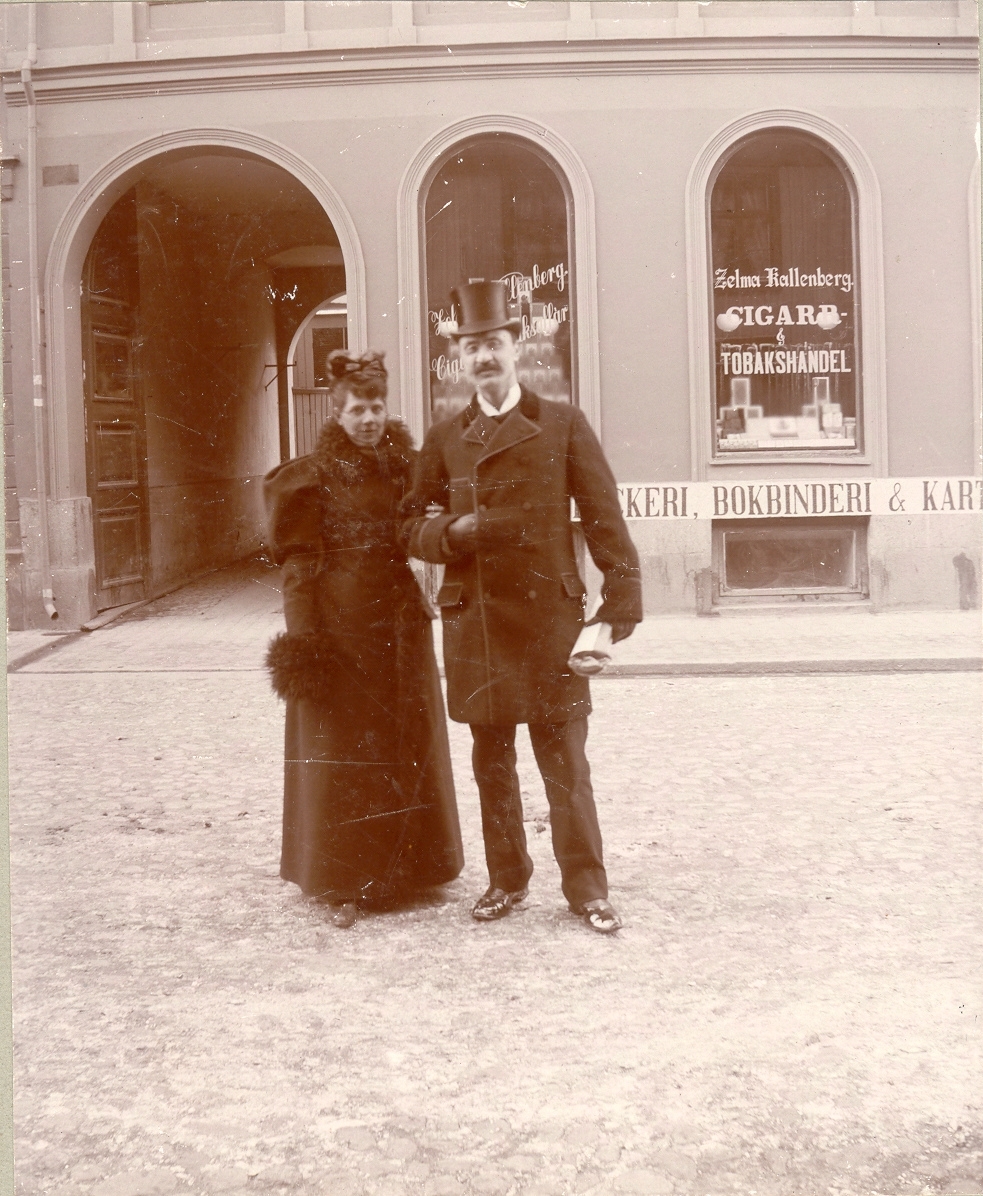 En man och en kvinna framför en butiksbyggnad. Text på skyltfönstret: "Zelma Hallenberg cigarr & tobakshandel".