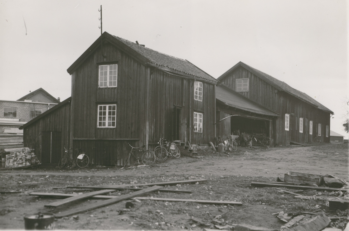 Förrådsbyggnader med träfasader och cyklar lutande på väggarna på varvet i Kalmar.