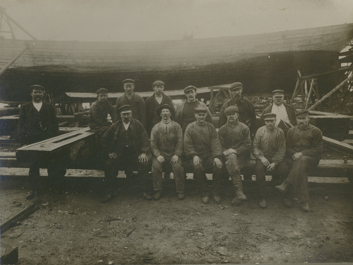 Varvsarbetare på en bänk framför ett fartyg på varvet i Kalmar.