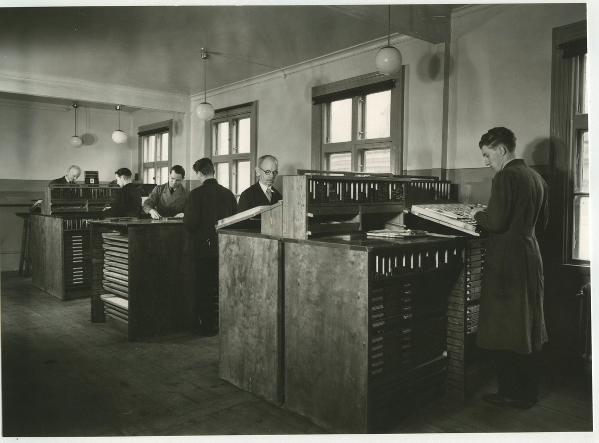 Interiör från Tidningen Barometern, med sättmaskiner.
