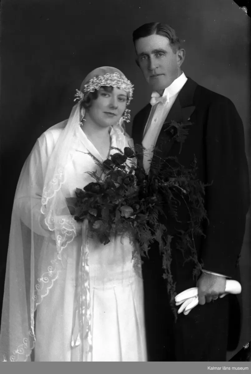 Bröllopsbild. Kvinnan är iförd brudslöja och håller i en blombukett medans mannen har en frack på sig och håller i ett par handskar. Beställare till bilden: Herr Torsten Lövgren ifrån Nybrogatan 20 i Kalmar.