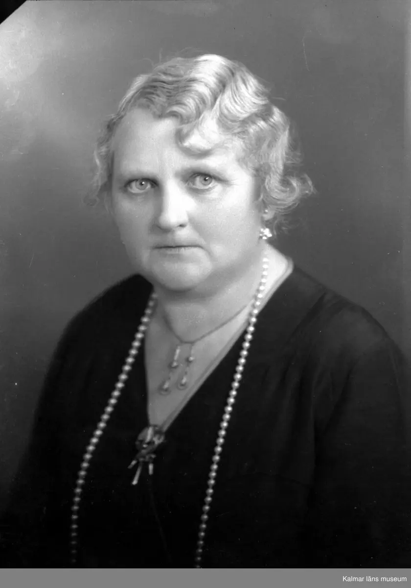 Ateljébild på en kvinna med pärlhalsband. Beställare till bilden: Fru stadsfiskal Tyra Carlman ifrån Borgholm.