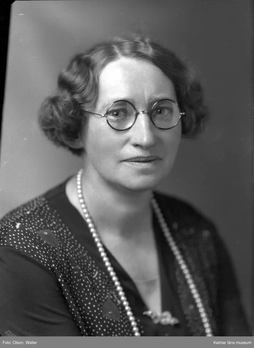 Ateljébild på en kvinna med väst, halsband och glasögon. Beställare till bilden: Lärarinnan Tekla Karlsson ifrån Lindero i Mörbylånga.