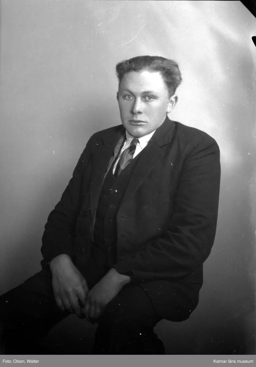 Ateljébild på en man i kostym och väst. Enligt Walter Olsons journal är bilden beställd av Gunnar Pettersson ifrån Loverslund.