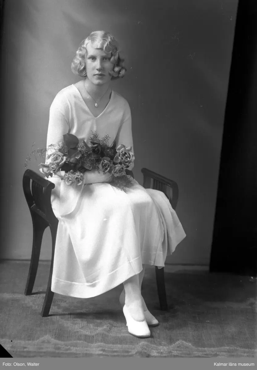 Ateljébild på en kvinna i klänning ihållandes en blombukett. Enligt Walter Olsons journal är bilden beställd av Stina Jansson.