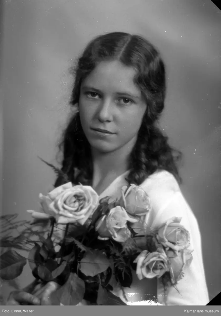 Ateljébild på en kvinna som håller en blombukett. Enligt Walter Olsons journal är bilden beställd av Dagmar Bohman.