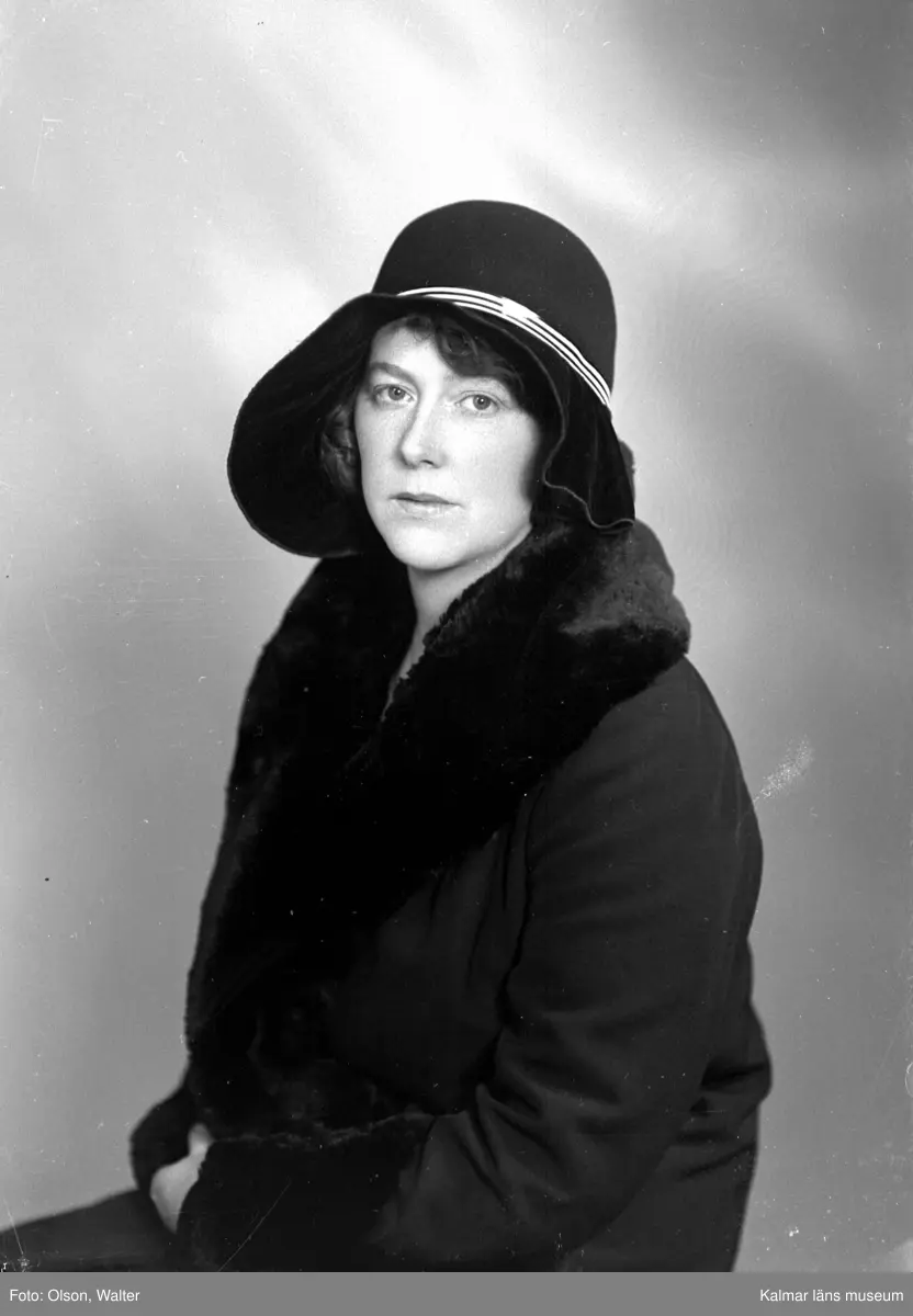 Ateljébild på en kvinna i rävboa och hatt. Enligt Walter Olsons journal är bilden beställd av fru K Gustring.