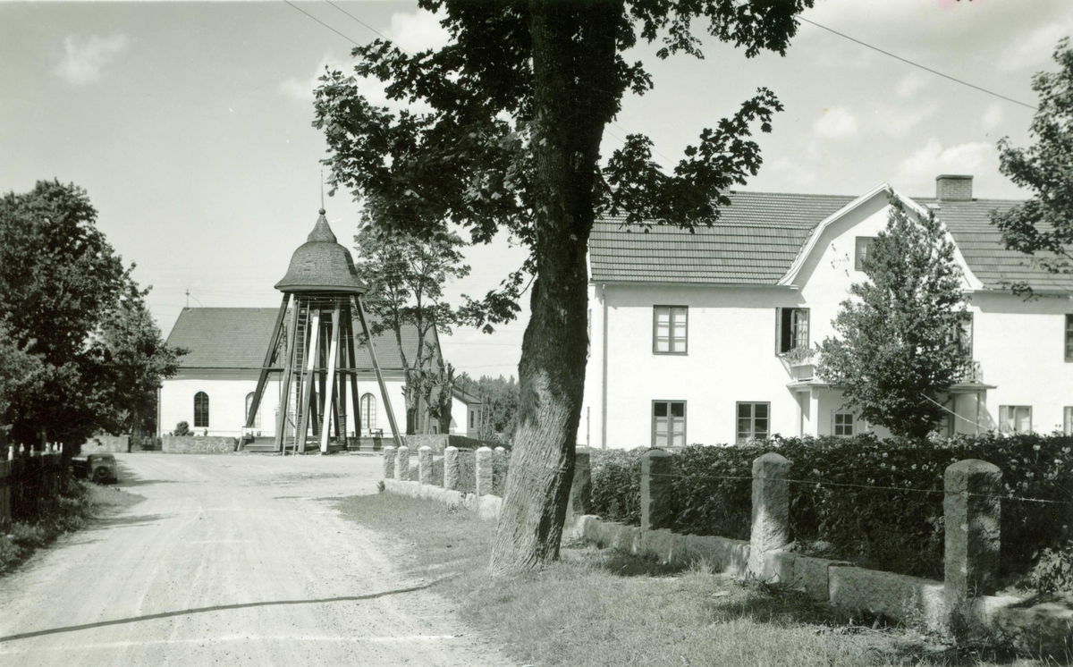 Hus, klockstapel och kyrka i Påryd.