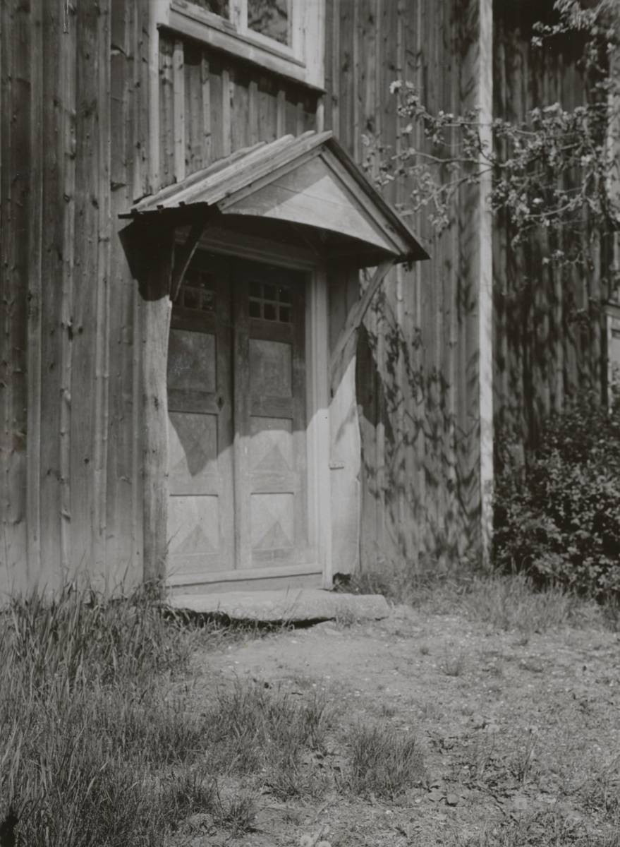 Den gamla, obebodda huvudbyggnaden med detalj av farstukvisten. Huset är enligt uppgift byggt 1821 och cirka 1884 byggdes övervåningen till. Parstuga med kök i mitten.