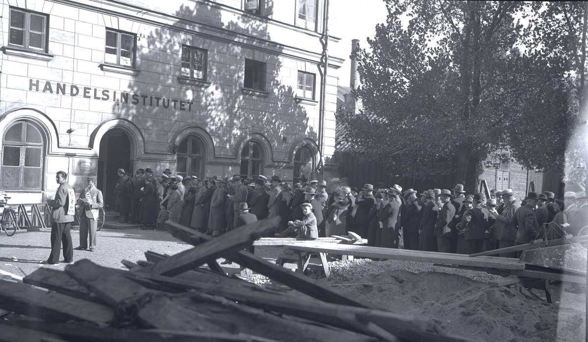 Valarbetare och kö av röstande vid valet 1936. Notera att valarbetaren längst till vänster tillhör ett nazistiskt parti.