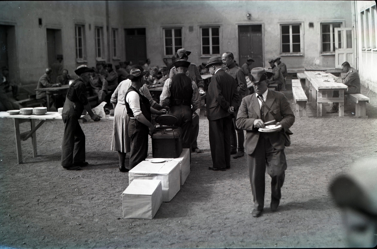 Matservering under beredskapen. Notera att vissa av männen endast har den trekantiga hatten och i övrigt är civila. Bristen på utrustning var stor 1939.
