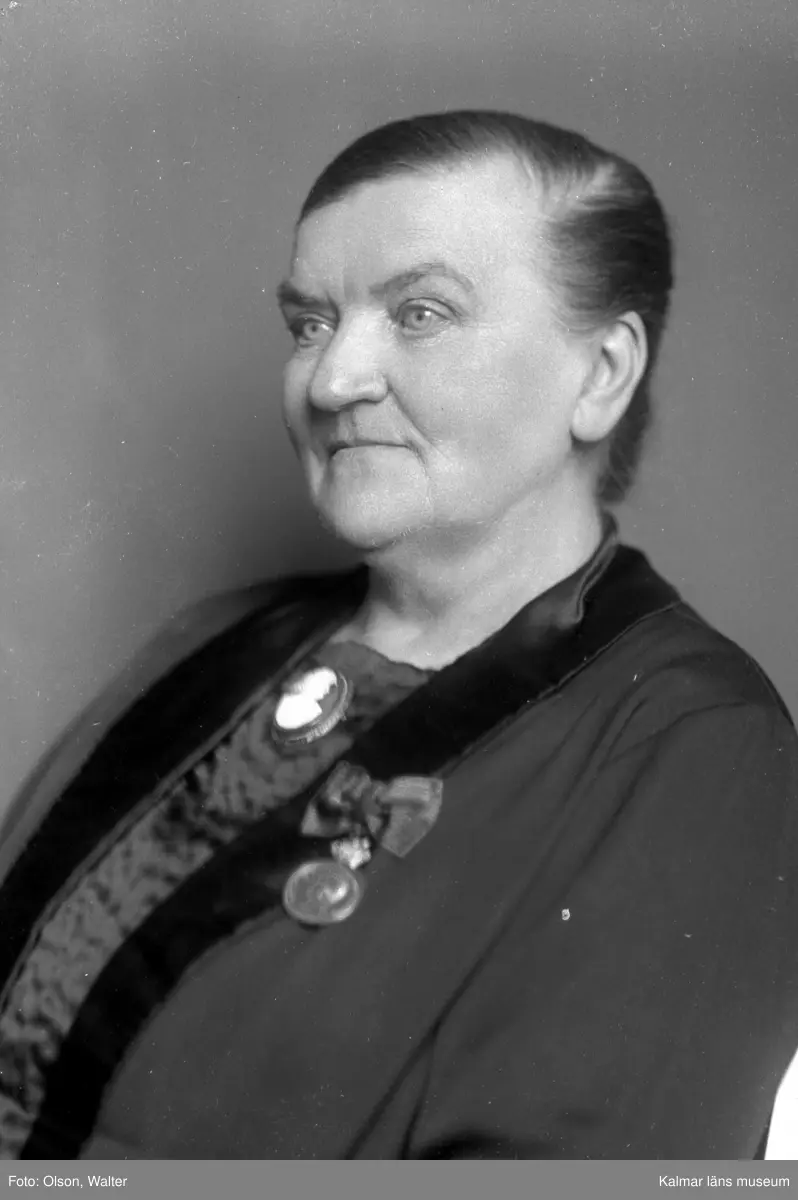 Ateljébild på Kristvalla sockens barnmorska Britta Österström. Hon tjänstgjorde i Kristvalla 1880-1930 och fick vid sin avgång medalj för lång och trogen tjänst. Britta Österström levde 1855-1937.
