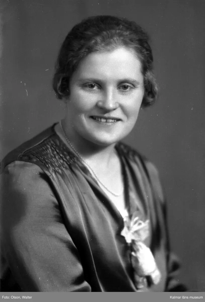 Ateljébild på en kvinna med brosch och klänning. Enligt Walter Olsons journal är bilden beställd av Astrid Andersson.