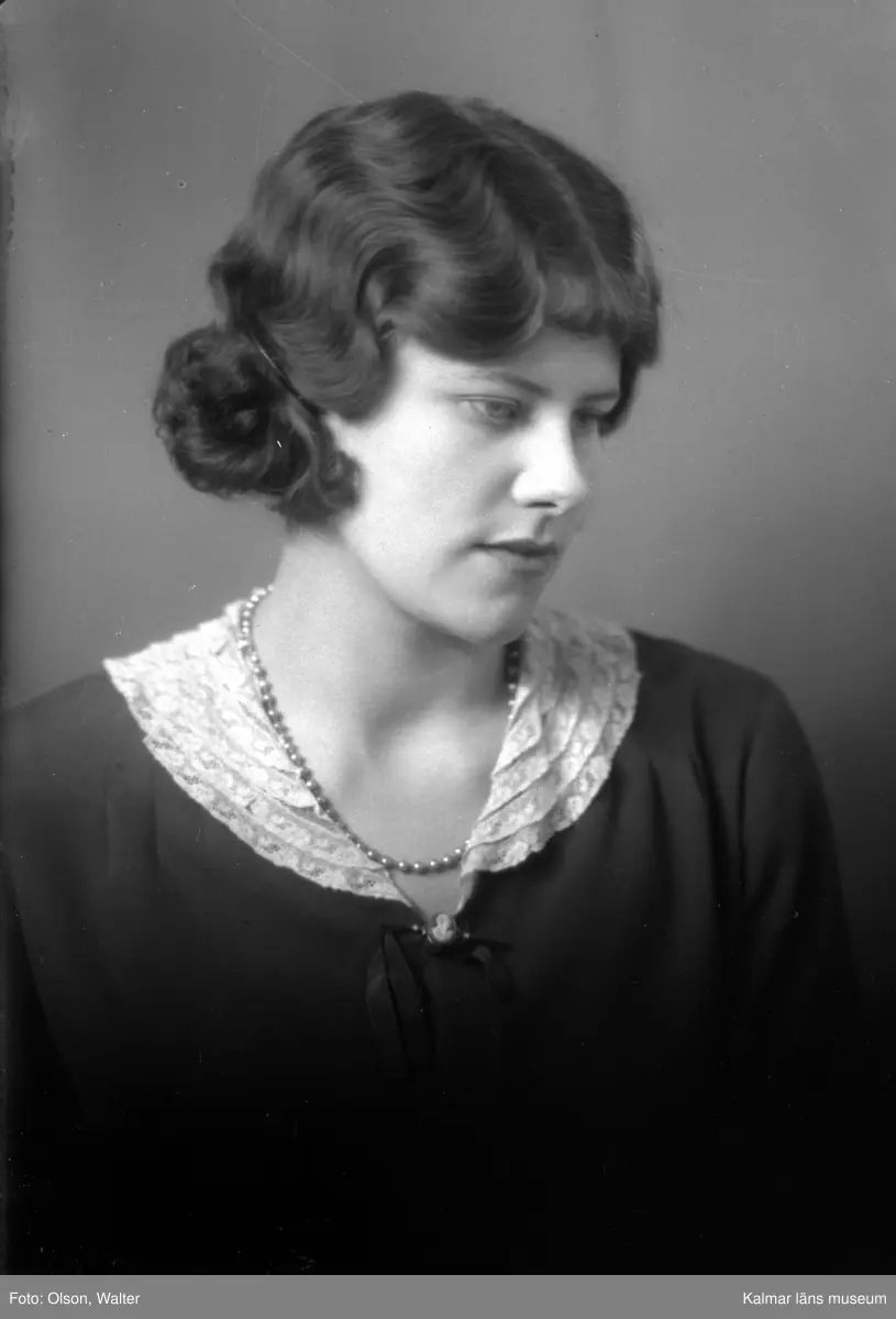 Ateljébild på en kvinna i halsband och klänning. Enligt Walter Olsons journal är bilden beställd av fröken Birgit Söderberg ifrån Hotell Witt.