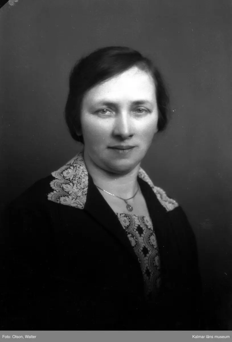 Ateljébild på en kvinna i halsband och klänning. Enligt Walter Olsons journal är bilden beställd av fröken Emma Rosén.