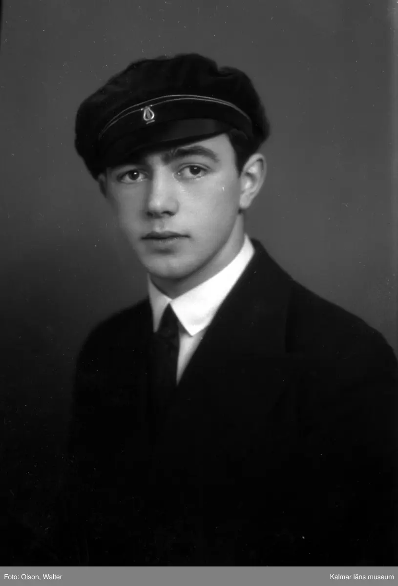Ateljébild på en man i kostym och mössa. Enligt Walter Olsons journal är bilden beställd av Åke Pettersson.