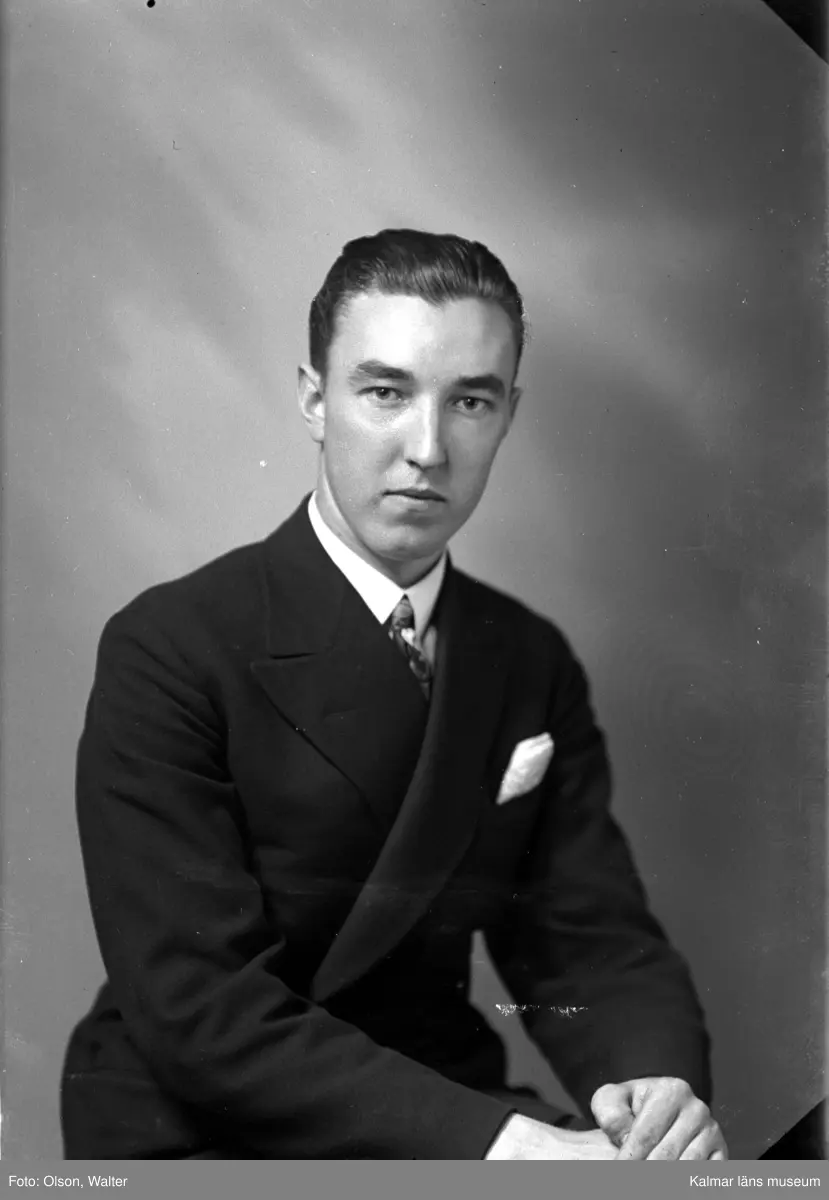 Ateljébild på en man i kostym och näsduk. Beställare till bilden: Göran Appeltofft ifrån Stortorget i Kalmar.
