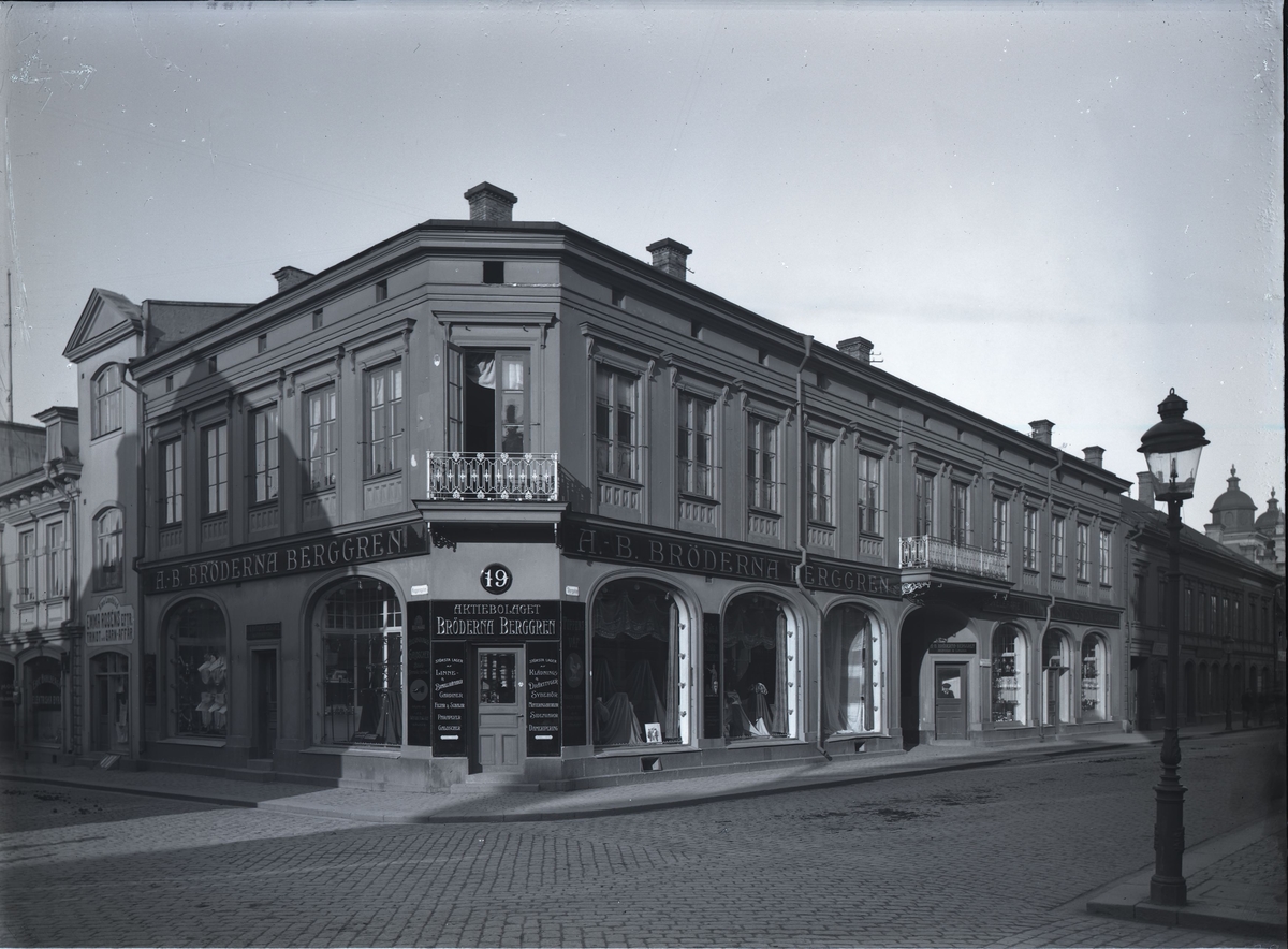 Bröderna Berggrens klädekiperingsaffär, hörnet Kaggensgatan och Storgatan.