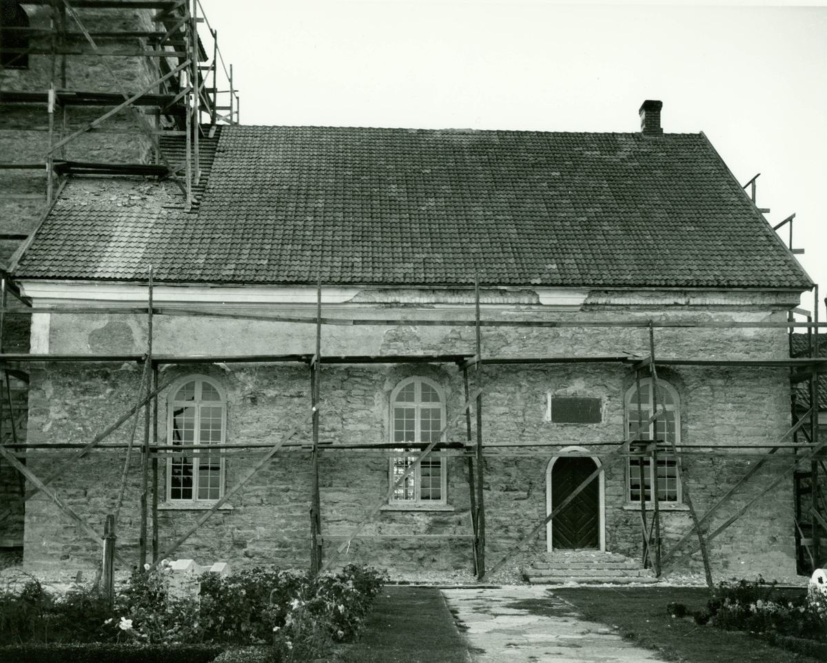 Böda kyrka under restaureringen 1942. Långhusets södra vägg med nedknackad puts, där man ser det medeltida murverket under.