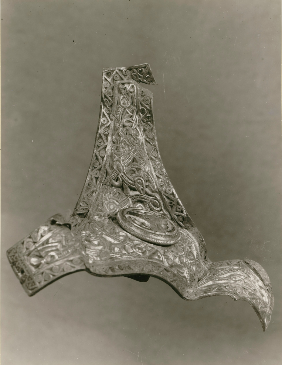 Beslag till sköldbuckla, i silver. Fornfynd från Nabberör.