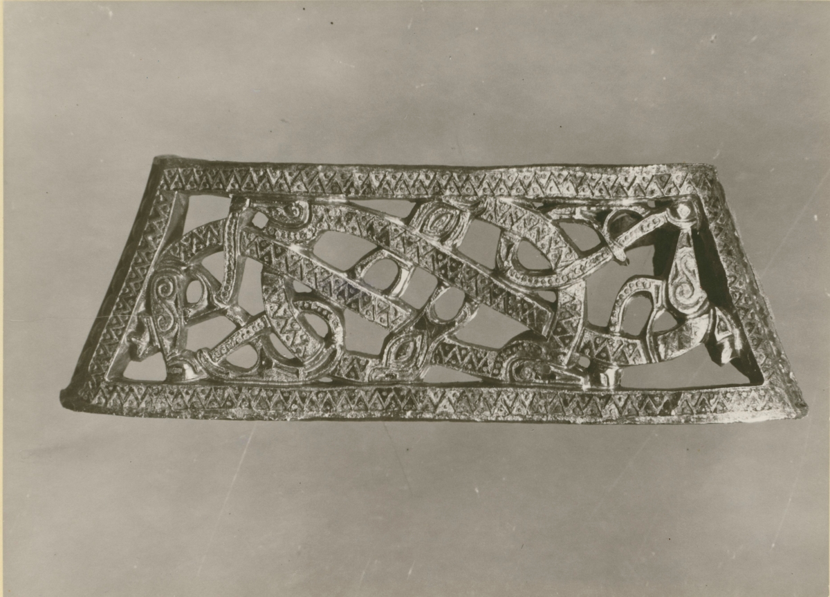 Beslag till sköldbuckla, i silver. Fornfynd från Nabberör.