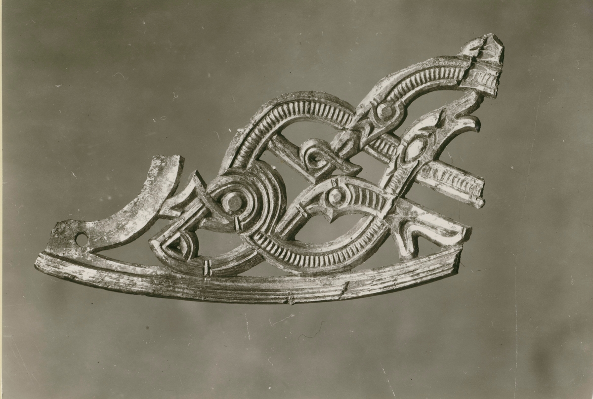 Del av beslag till sköldbuckla, i silver. Fornfynd från Nabberör.