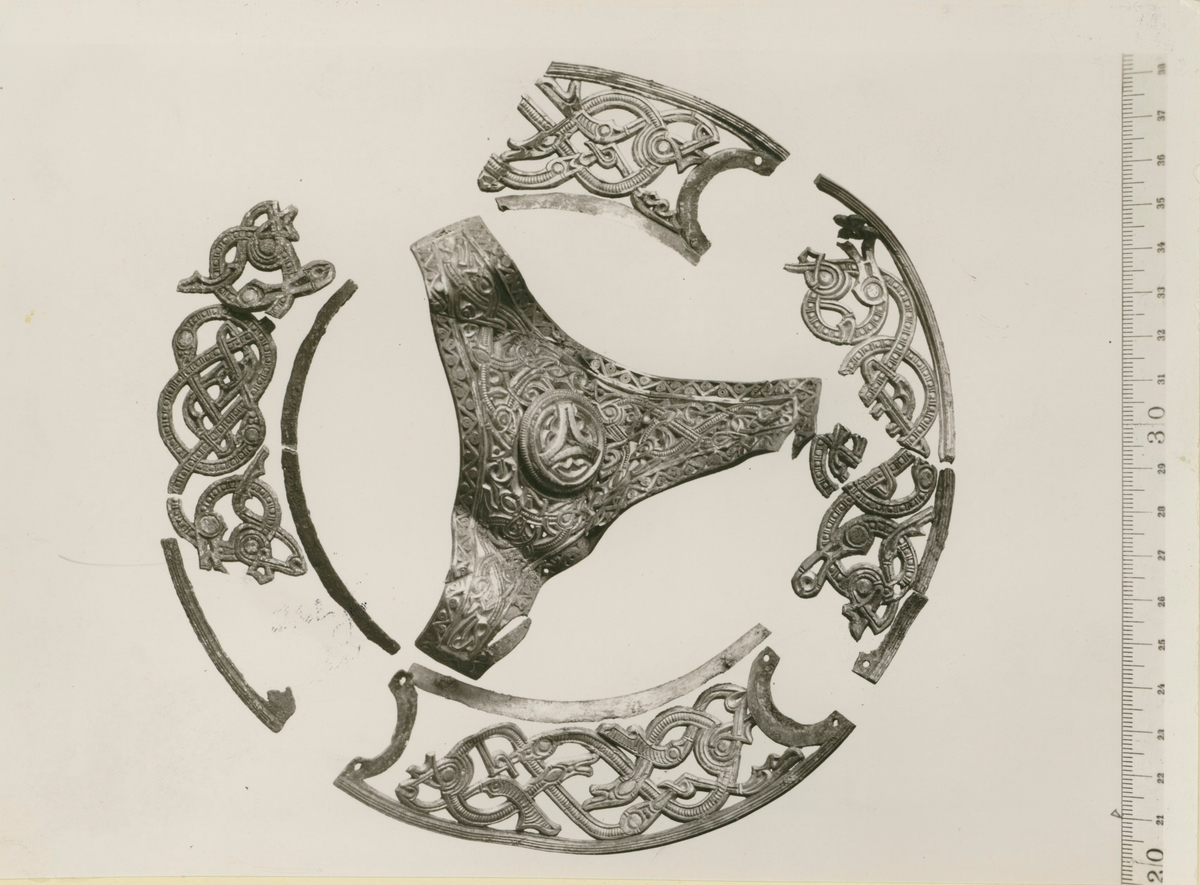 Ett trearmat toppbeslag av förgylld brons med en runt kanten pånitad bård av niello-inlagt silver. Djurornamenten gjutna och efteråt något uppskurna, silverbården däremot har ett mönster, som har skurits i det tunna silverblocket sedan detta anbringats på bronsbelsget: där silverbeslaget nu är skadat syns nämligen hur verktyget ibland skurit ned även i bronsen. Alla försänkta fält och cirkellinjer på silvred har en gång varit helt utfyllda med niello. Mitt på beslaget ett försänkt runt fält utan förgyllning, vilket helt täckts av toppknappen. För dennas stift är uttaget ett stort hål i entrum och intill detta finnes hål efter tre små järnstift, varmed toppbeslaget varit fästat: ett stift sitter kvar. Ett liknande stift finnes vid ytterändan av varje arm. Beslaget är starkt förböjt och har flera huggmärken, varav ett tvärs över en arm gående torde vara gjort med finare eggredskap, möjligen ett svärd, andra sannolikt med en spade.