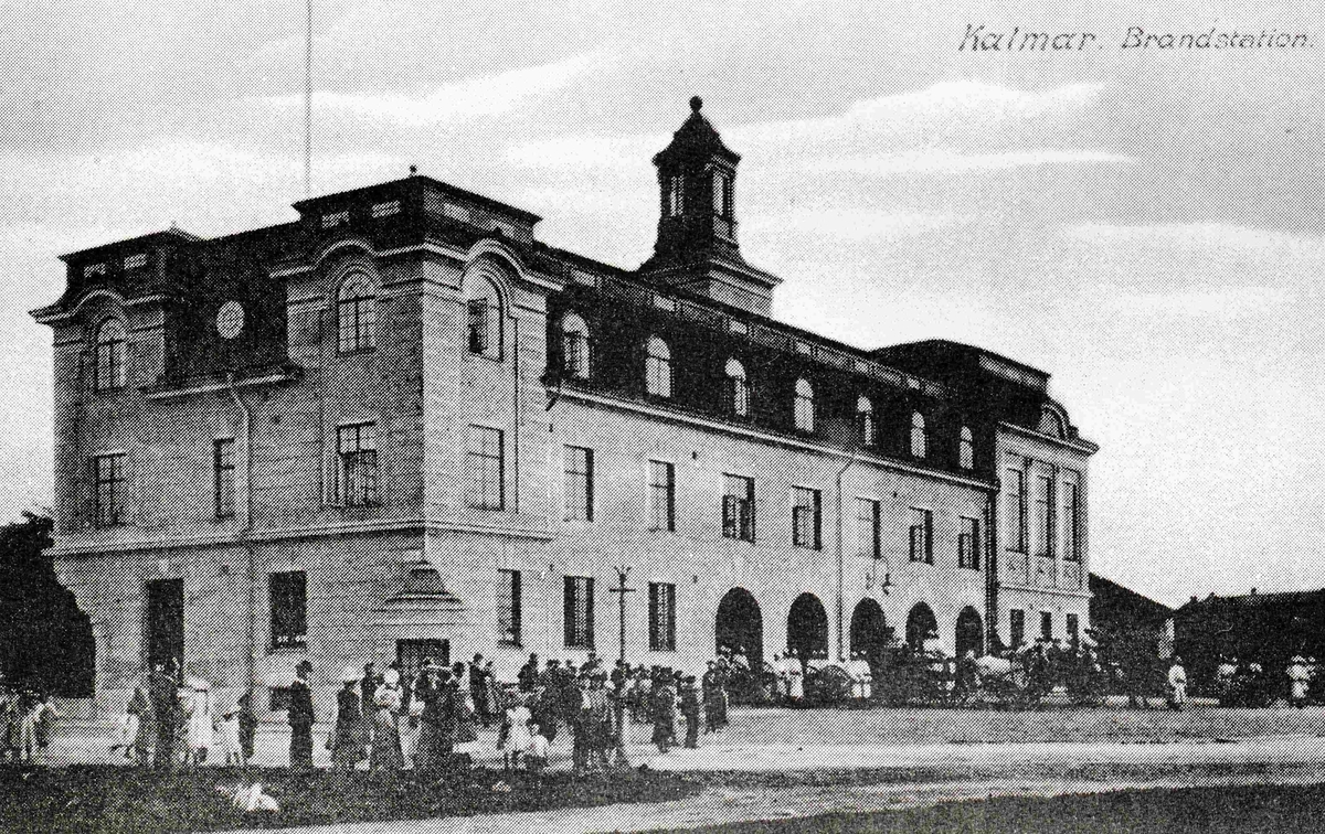 Vykort med folk, brandmän och brandfordon dragna av hästar uppställda utanför brandstationen.