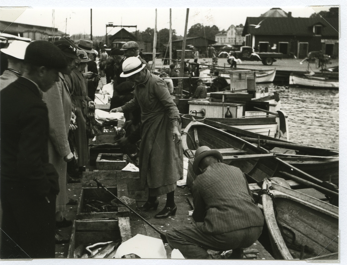 Ölandshamnen (Fiskbron). Försäljning av fisk ur lådor, stående direkt på kajen.