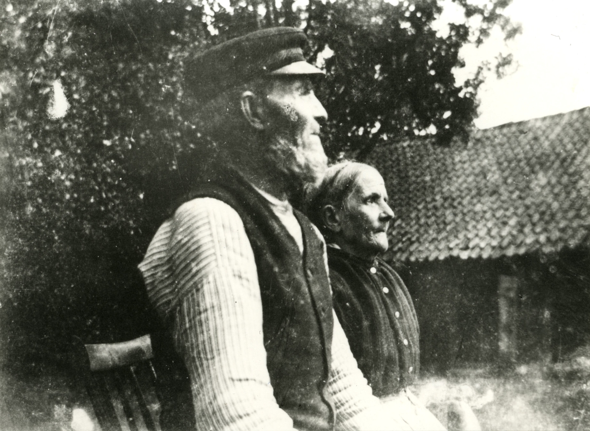 På bilden sitter trotjänaren och kusken Johan Jonsson med sin hustru Johanna vid den lilla stuga på Stensbergs lantgård, som ägdes och sommartid beboddes av rektor O. E. L. Dahm. Förre ägaren hade varit gästgivare och då hade bryggts brännvin i ett av rummen i stugan. Johans barnbarn Viktor-Hugo Elmqvist, Sonja och Karl-Bernhard Sandbäck kom ibland på besök. Stugan och gårdens ekonomibyggnader låg mitt emot Stensbergs ännu befintliga huvudbyggnad.