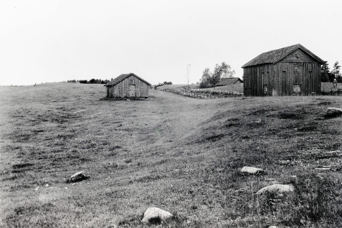 Marknadsplatsen. Till vänster "Komedianthuset", till höger finkan. Det förra av stolpar och bräder; användes av artister som uppträdde vid stormarknaderna. Finkan av laxknutat timmer. Båda husen tillhör byn gemensamt. Rivet slutet av 1930-talet.