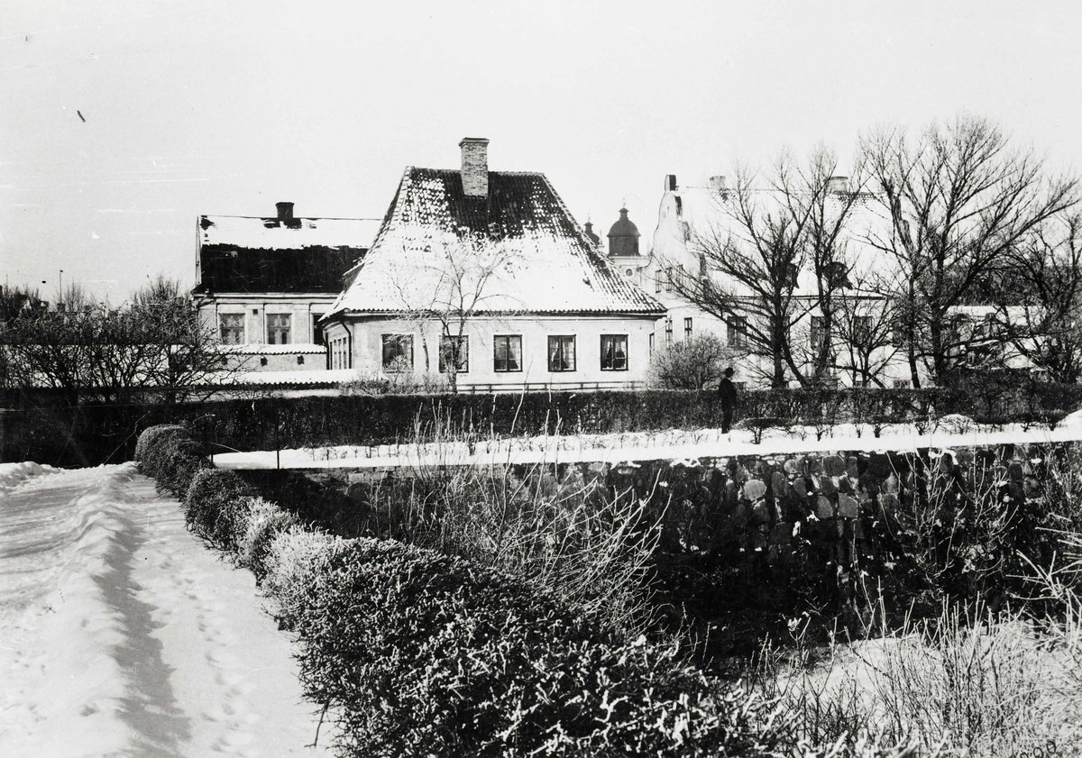 Vinterbild från vallen med domprostgården före byggandet av pastorsexpeditionen. Länsstyrelsen före tillbyggnaden mot söder.