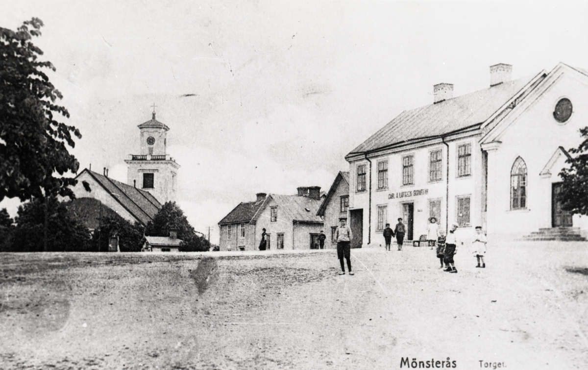 Vy med kyrkan till vänster och Carl A. Löfgrens skoaffär till höger.